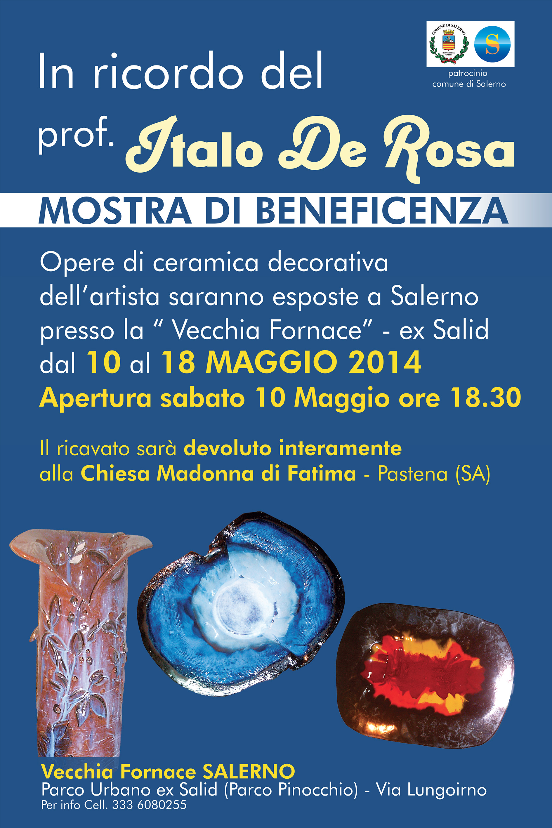 Sabato 10 maggio, alle ore 18.30, presso la vecchia fornace, all'interno del Parco Ex Salid, si inaugura la mostra di beneficenza "In ricordo del prof. Italo De Rosa". Fino a domenica 18 maggio saranno esposte opere di ceramica decorativa dell'artista. Il ricavato sarà devoluto interamente alla Chiesa Madonna di Fatima di Pastena.