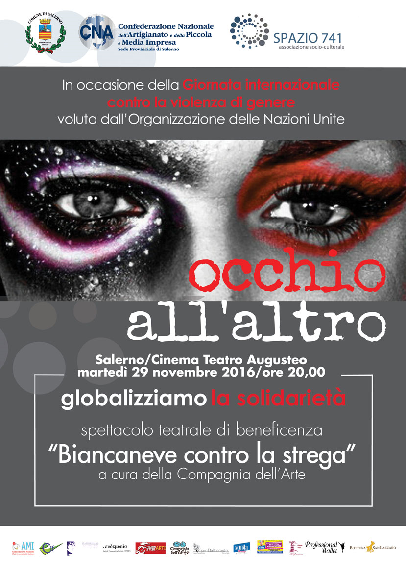 Martedì 29 novembre, alle ore 20.00, presso il Cinema Teatro Augusteo, in occasione della Giornata internazionale contro la violenza di genere voluta dall'Organizzazione delle Nazioni Unite, si terrà la manifestazione "Occhio all'altro. Globalizziamo la Solidarietà". Nel corso dell'evento è in programma lo spettacolo teatrale di beneficenza "Biancaneve contro la strega" a cura della Compagnia dell'Arte.