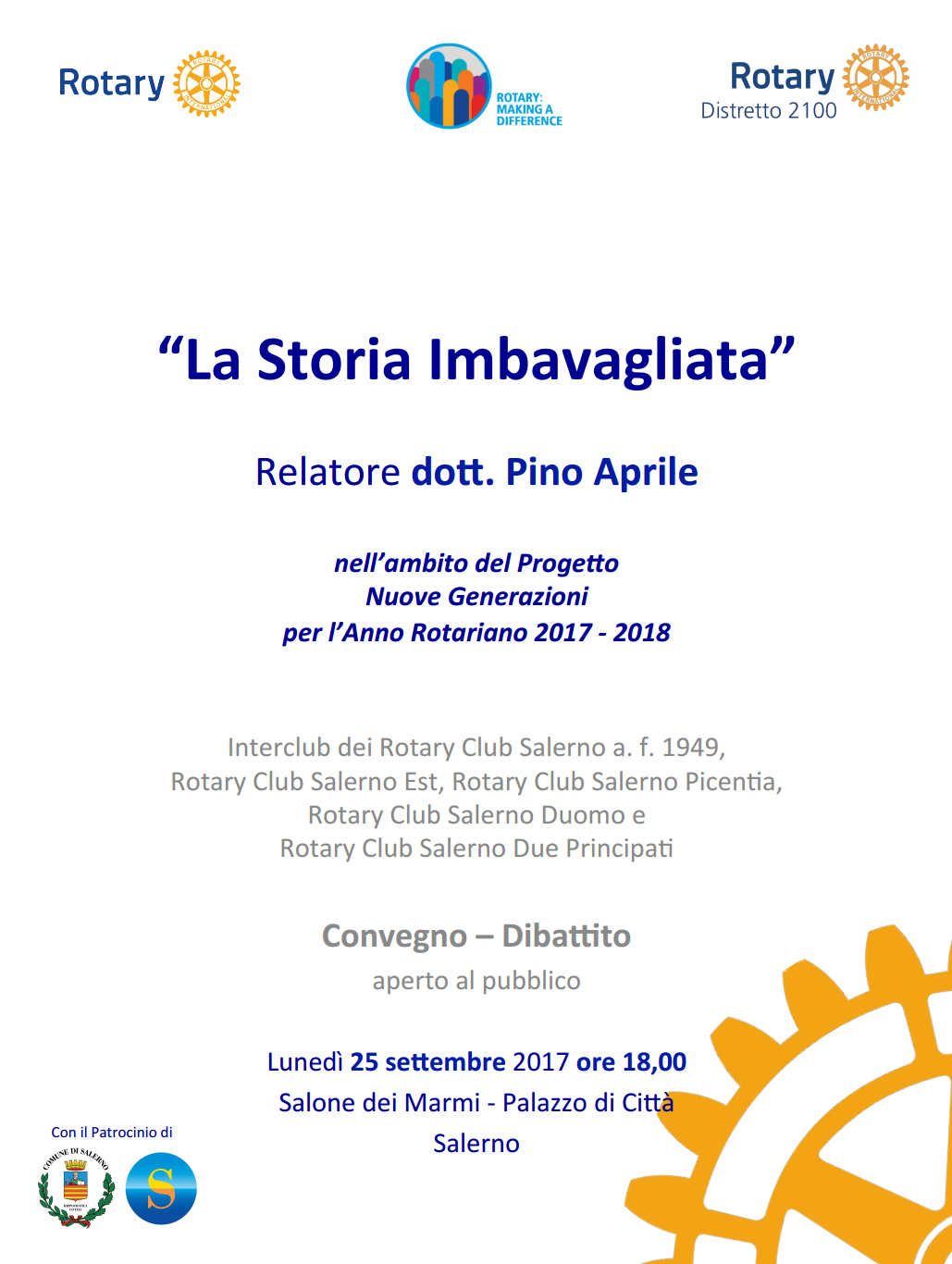 Lunedì 25 settembre alle ore 18, nell’ambito del Progetto Nuove Generazioni per l’Anno Rotariano 2017 – 2018, i ROTARY CLUB della città di Salerno, hanno organizzato, nel Salone dei Marmi di Palazzo di Città, il convegno-dibattito dal titolo “La Storia Imbavagliata”.