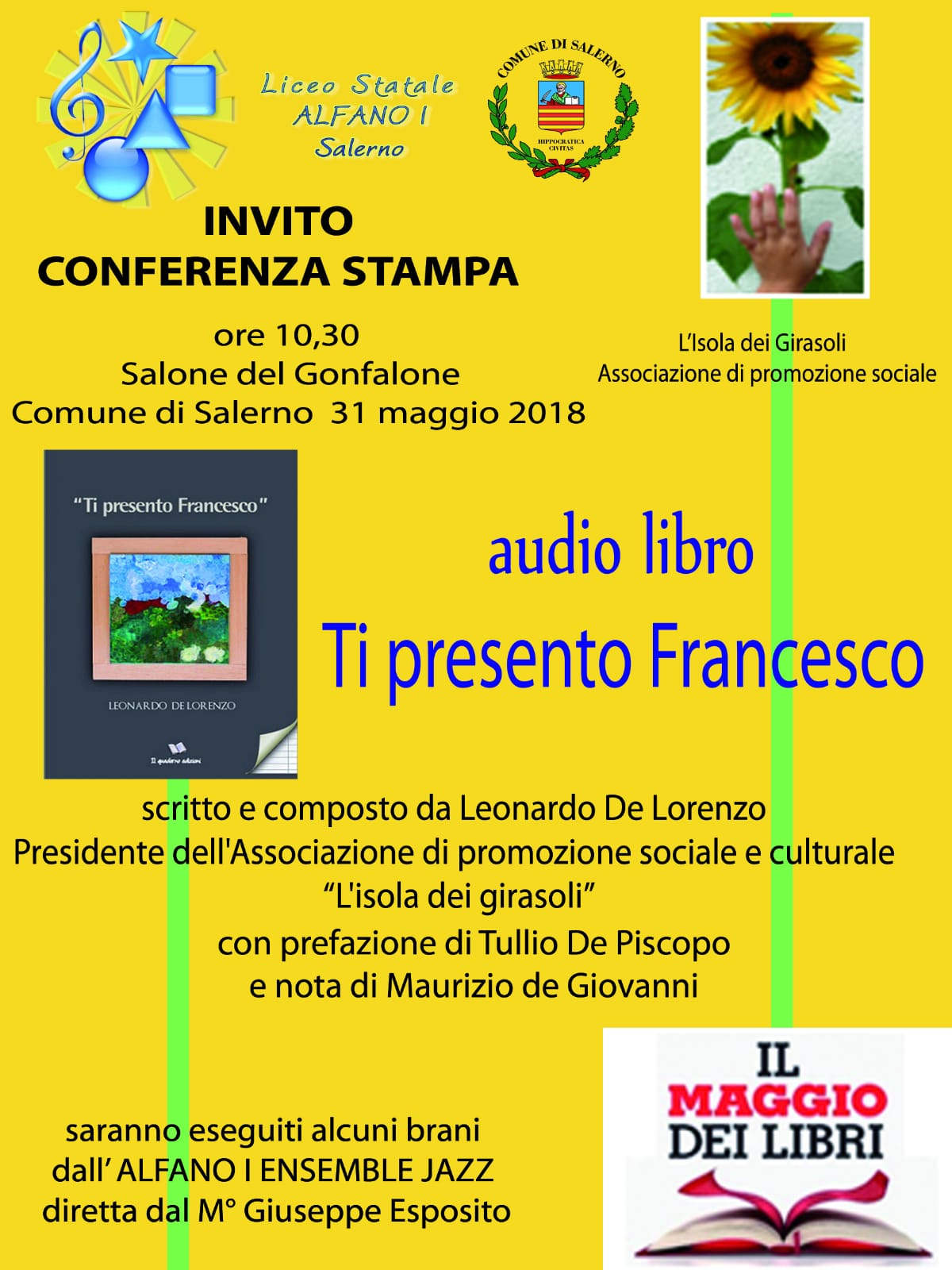 Giovedì 31 maggio alle ore 10.30, nella Sala del Gonfalone del Comune di Salerno si terrà la conferenza di presentazione del libro “TI PRESENTO FRANCESCO” di Leonardo De Lorenzo. Interverrà il Sindaco di Salerno Vincenzo Napoli con la partecipazione live dell’Ensemble Jazz del Liceo “Alfano I” di Salerno che eseguirà alcuni brani del libro composti dall’autore.