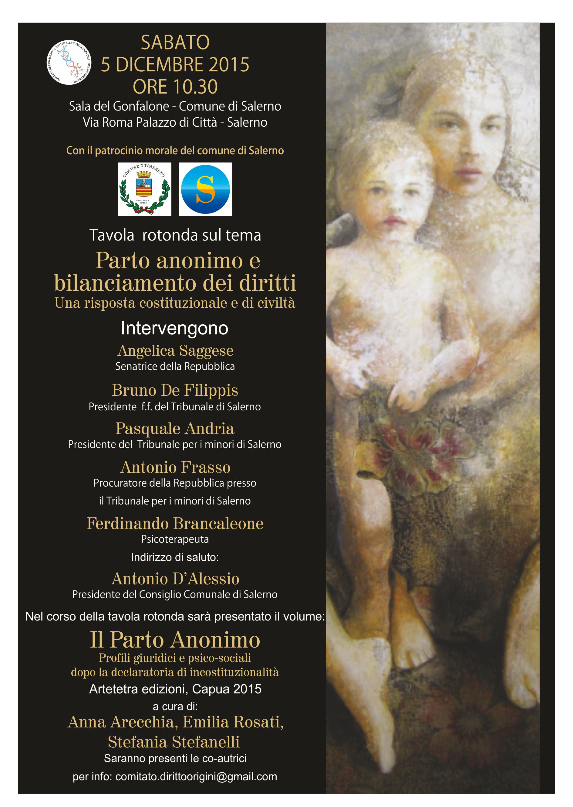 Sabato 5 dicembre alle ore 10.30 si svolgerà a Salerno, presso la Sala del Gonfalone del Palazzo di Città, una tavola rotonda su un argomento di essenziale importanza per circa quattrocentomila cittadini italiani: il parto anonimo, le sue implicazioni e la necessità di bilanciamento dei diritti.