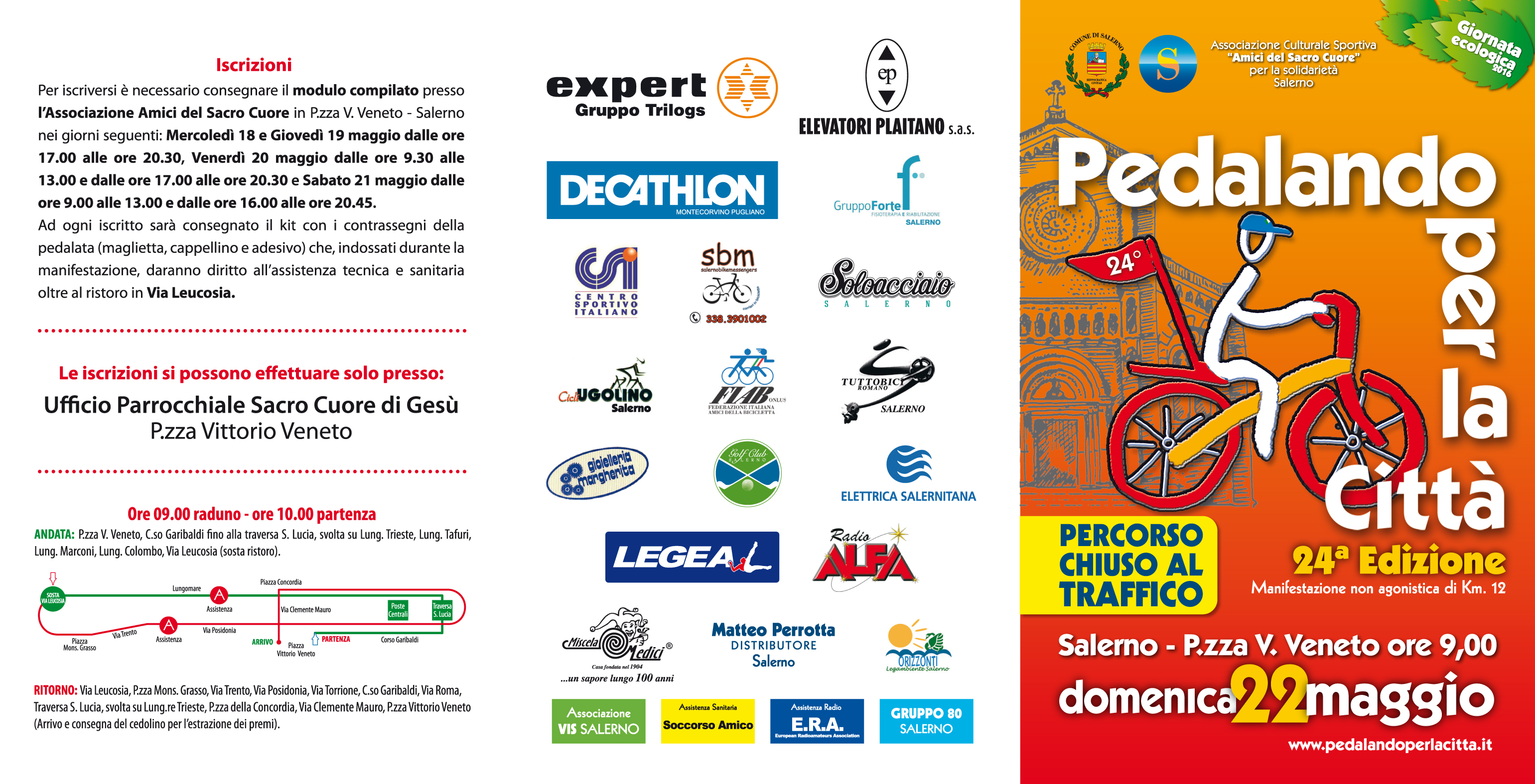 Si terrà domenica 22 maggio, a partire dalle ore 9.00, la XXIV edizione di Pedalando per la Città, l’ormai tradizionale appuntamento cittadino con la pedalata in bicicletta con bambini, appassionati, famiglie, atleti e con gli sportivi di ogni età, organizzata dall’Associazione Amici del Sacro Cuore e patrocinata dal Comune di Salerno.