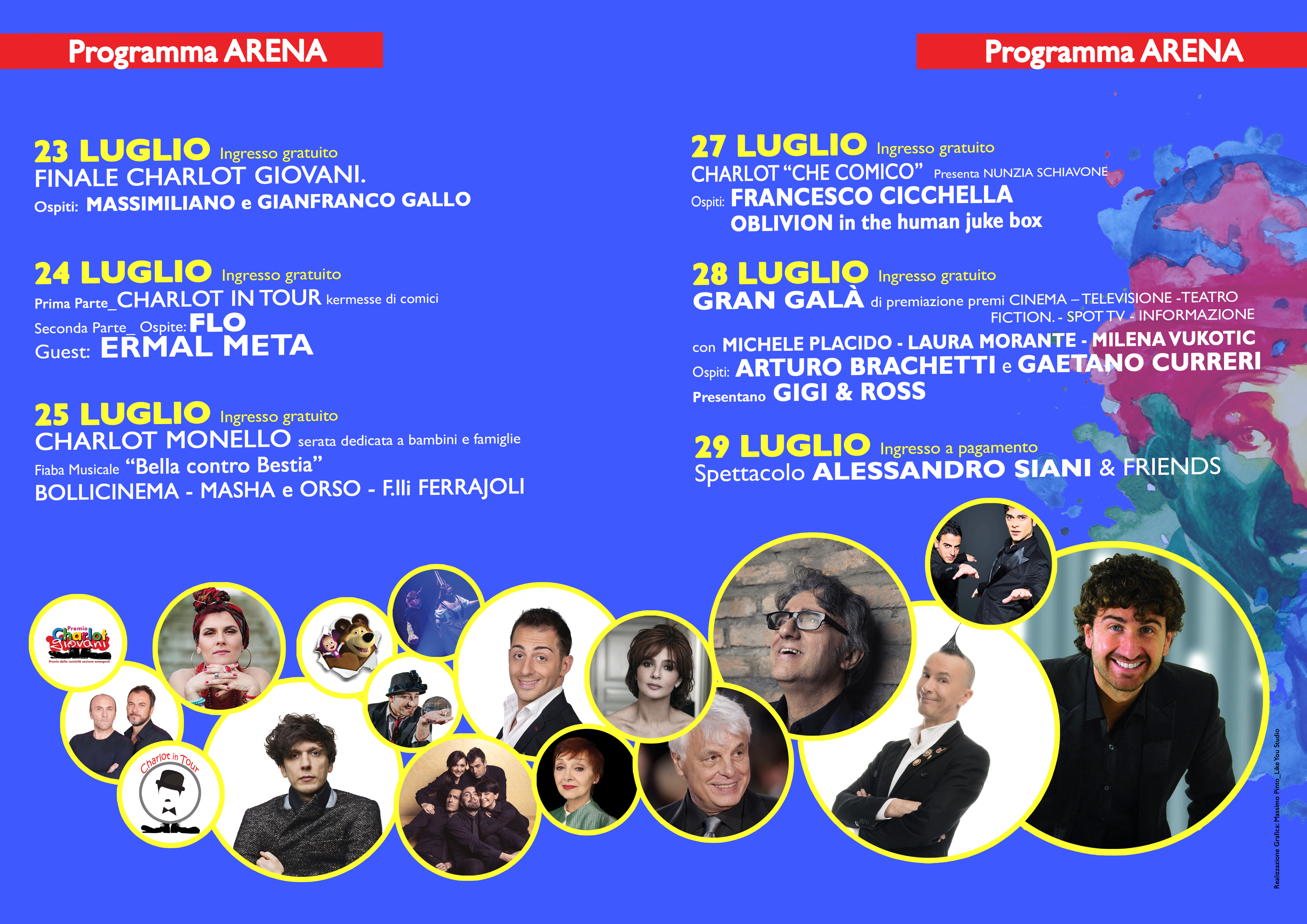 Il 24 luglio spazio al cabaret e alla musica. Sul palco ci saranno 10 dei cabarettisti che hanno preso parte allo Charlot Lab e il concerto di Ermal Meta e Flo, considerata una delle personalità più eclettiche e versatili del nuovo panorama musicale italiano.
