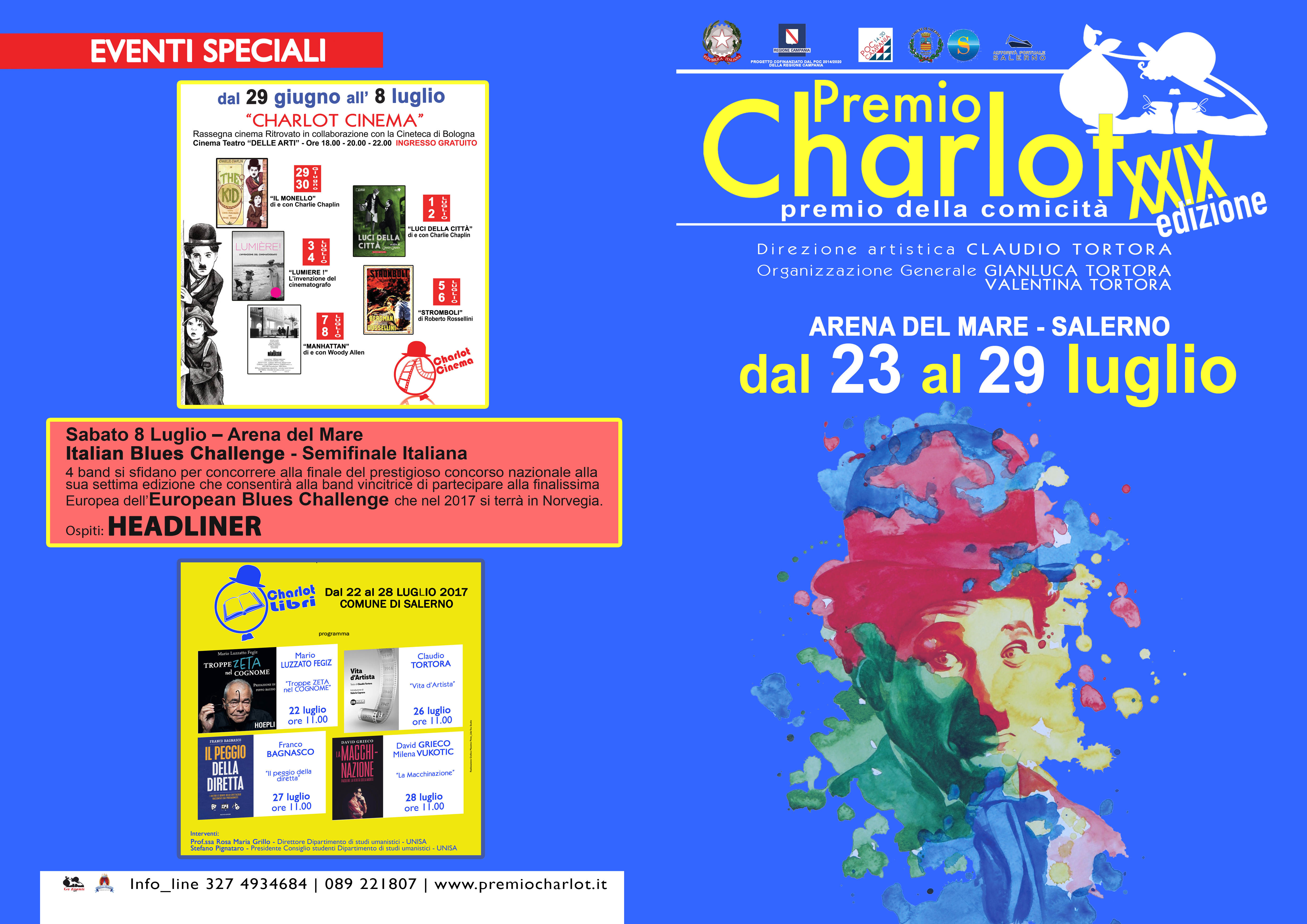 Si preannuncia ricca di ospiti e sorprese, la ventinovesima edizione del Premio Charlot, la kermesse ideata e organizzata da Claudio Tortora, con il sostegno della Regione Campania, del Comune di Salerno e dell’Autorità Portuale, che con vari appuntamenti si snoderà dal 28 giugno, fino alla serata finale del 29 luglio.