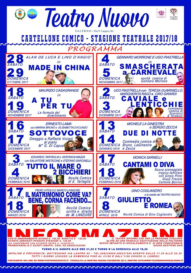 Ugo Piastrella, direttore artistico del Nuovo, ha dunque presentato il nuovo cartellone comico: da ottobre a marzo prossimi calcheranno le scene del Nuovo numerosi noti attori e registi del panorama teatrale nazionale. Tra gli altri, Maurizio Casagrande, Monica Sarnelli, Alan De Luca, Lino D'Angiò, Ernesto Lama, Michele La Ginestra, Eduardo Tartaglia, Veronica Mazza, Salvatore Misticone, Gino Cogliandro, Gennaro Morrone, Piero Vitolo e, ovviamente, Ugo Piastrella, Ciro Girardi e gli altri membri storici della stabile del Teatro Nuovo. Dieci gli spettacoli in programma. L'abbonamento avrà un costo di 150 euro, ridotto 130 euro per gli over 65 e gli studenti, solo 120 euro per i vecchi abbonati che confermeranno anche quest'anno la loro tessera. Per info e prenotazioni, tel. 089.220886 (botteghino).
