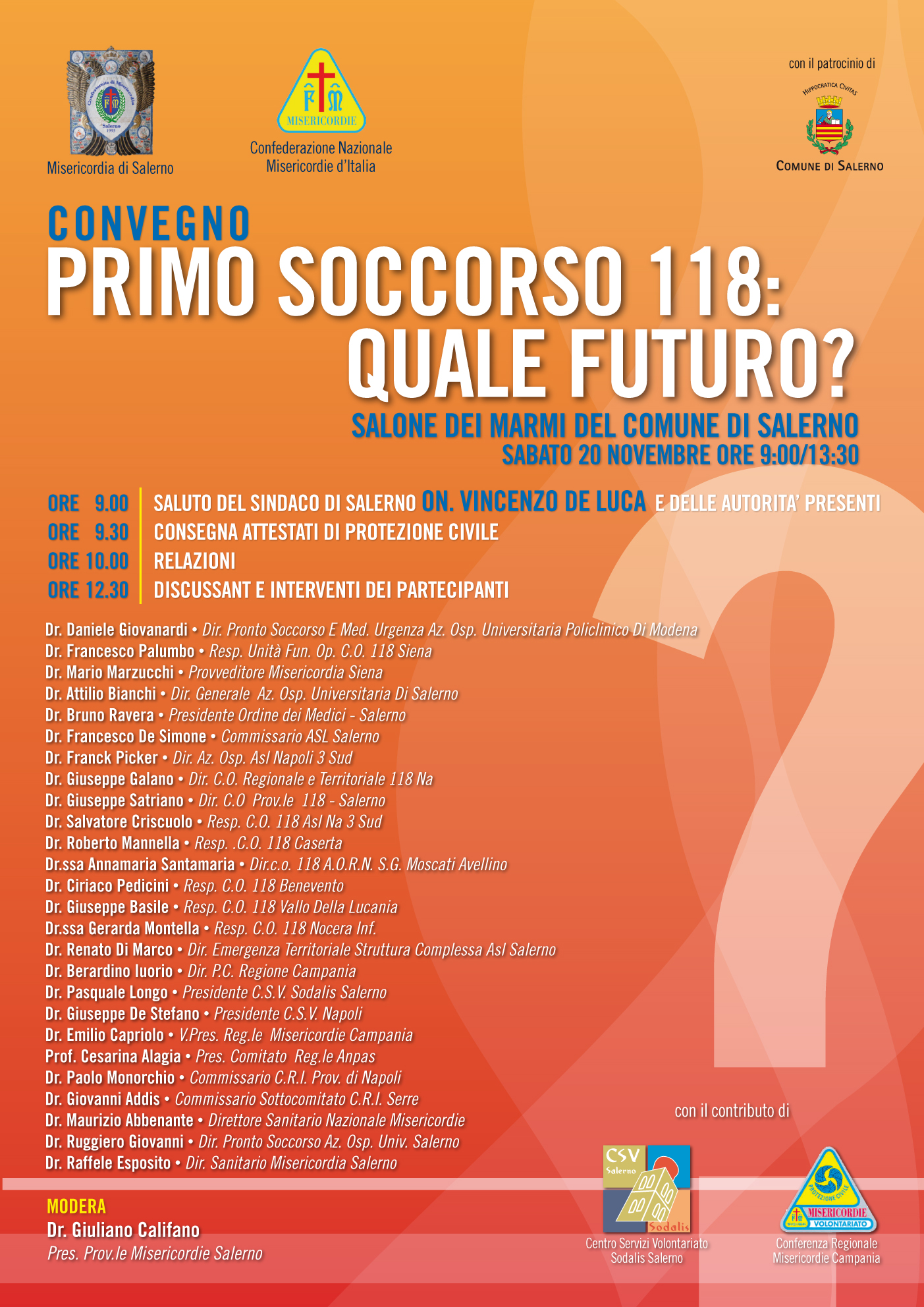 La Misericordia di Salerno con la Confederazione Nazionale Misericordie d'Italia ha organizzaton il convegno "Primo Soccorso: Quale Futuro?" con il patrocinio del Comune di Salerno.