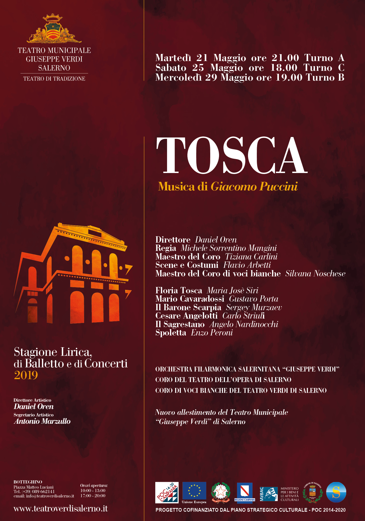 Prosegue con Tosca di Giacomo Puccini la Stagione Lirica 2019 del Teatro Verdi di Salerno. Di seguito tutte le informazioni sull'opera, gli spettacoli, il cast, gli allestimenti.