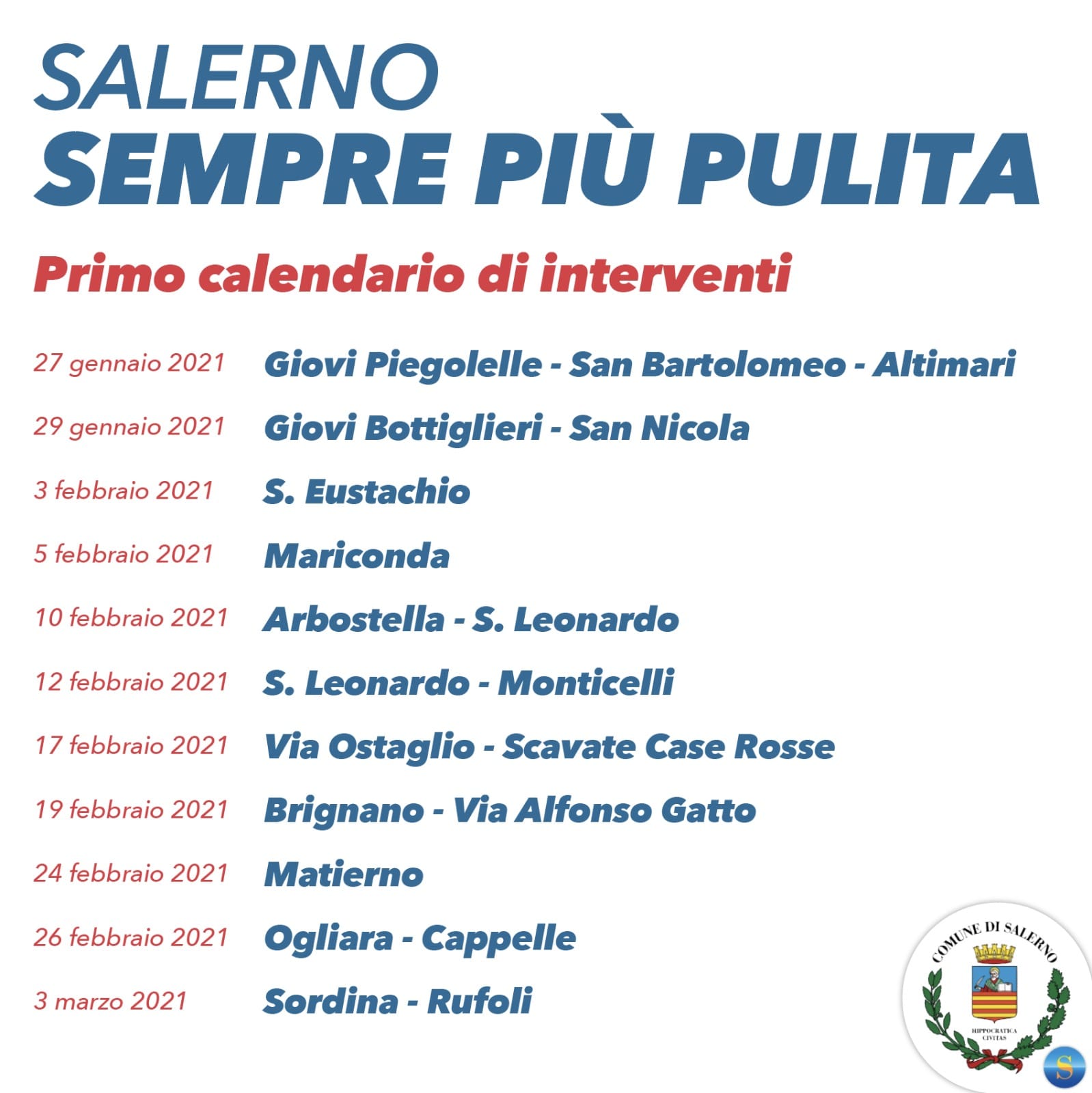 Descrizione In allegato il calendario degli interventi di pulizia straordinaria nei quartieri della città. Nelle prossime settimane saranno progressivamente coperte tutte le aree del comune.