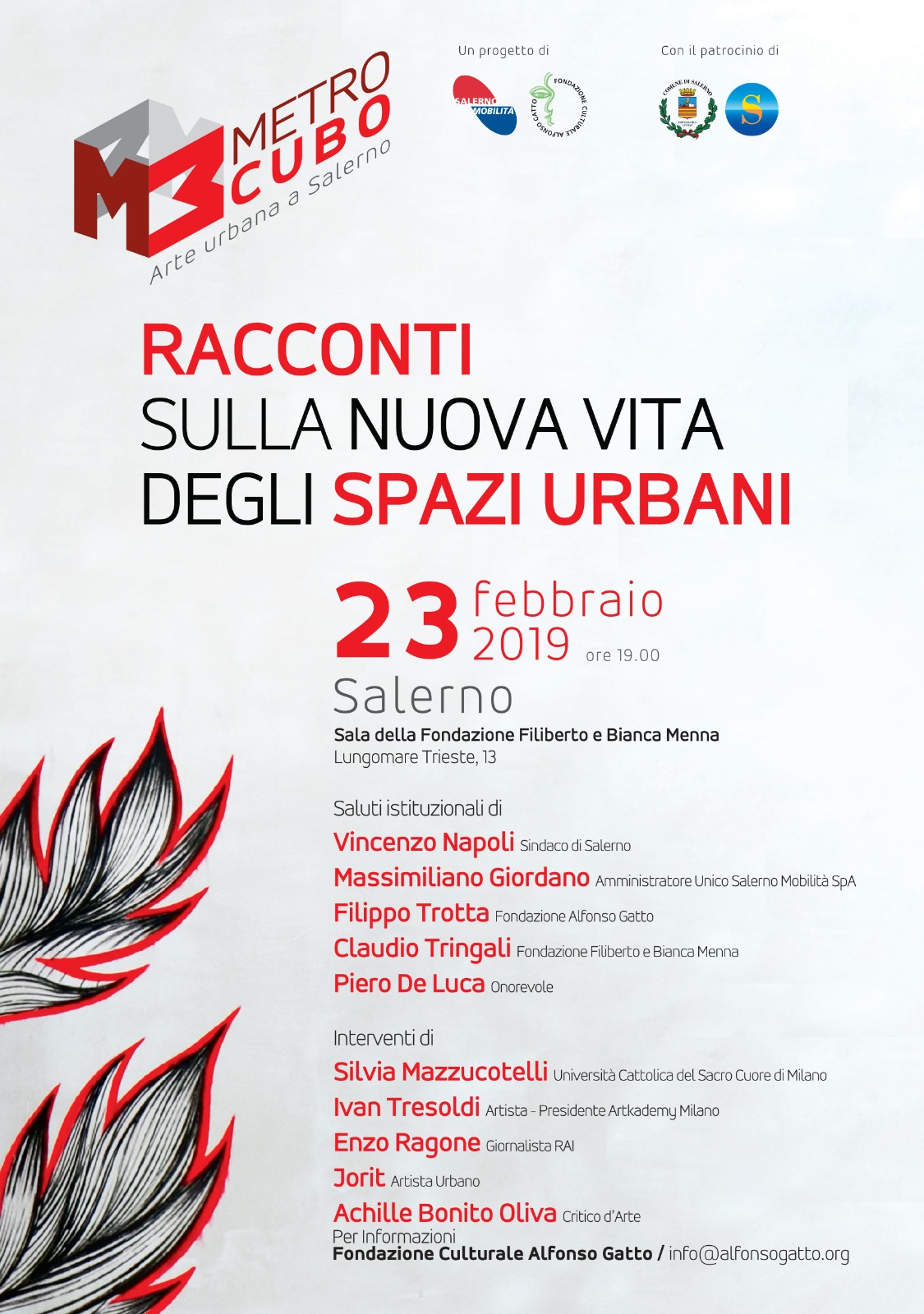 Nell'ambito del progetto Metro Cubo, si terrà sabato 23 febbraio, alle ore 19, nel salone di rappresentanza della Fondazione Bianca e Filiberto Menna, a Salerno, la tavola rotonda dal titolo "Racconti sulla nuova vita degli spazi urbani". Si tratta di un evento realizzato da Salerno Mobilità, in collaborazione con la Fondazione Alfonso Gatto, con il patrocinio del Comune di Salerno.