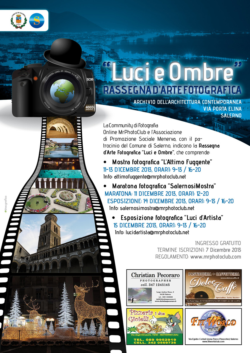 In occasione dell’ottava edizione dell’esposizione d’arte luminosa Luci d’Artista per le strade di Salerno, la Community di Fotografia Online MrPhotoClub e l’Associazione di Promozione Sociale Menerva, con il patrocinio del Comune di Salerno, indicono la prima edizione della Rassegna d’Arte Fotografica “Luci e Ombre”, presso la sede dell’Archivio dell’Architettura Contemporanea, situata in via Porta Elina (adiacente piazza Portanova) a Salerno. La manifestazione comprende tre eventi: