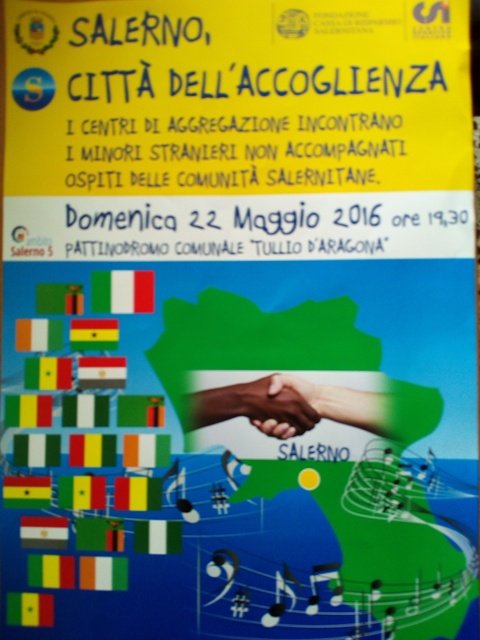 Domenica 22 maggio, alle ore 19.30, presso il Pattinodromo Comunale, si terrà l'iniziativa "Salerno, città dell'accoglienza". I centri di aggregazione cittadini incontreranno i minori stranieri non accompagnati ospiti delle comunità salernitane.