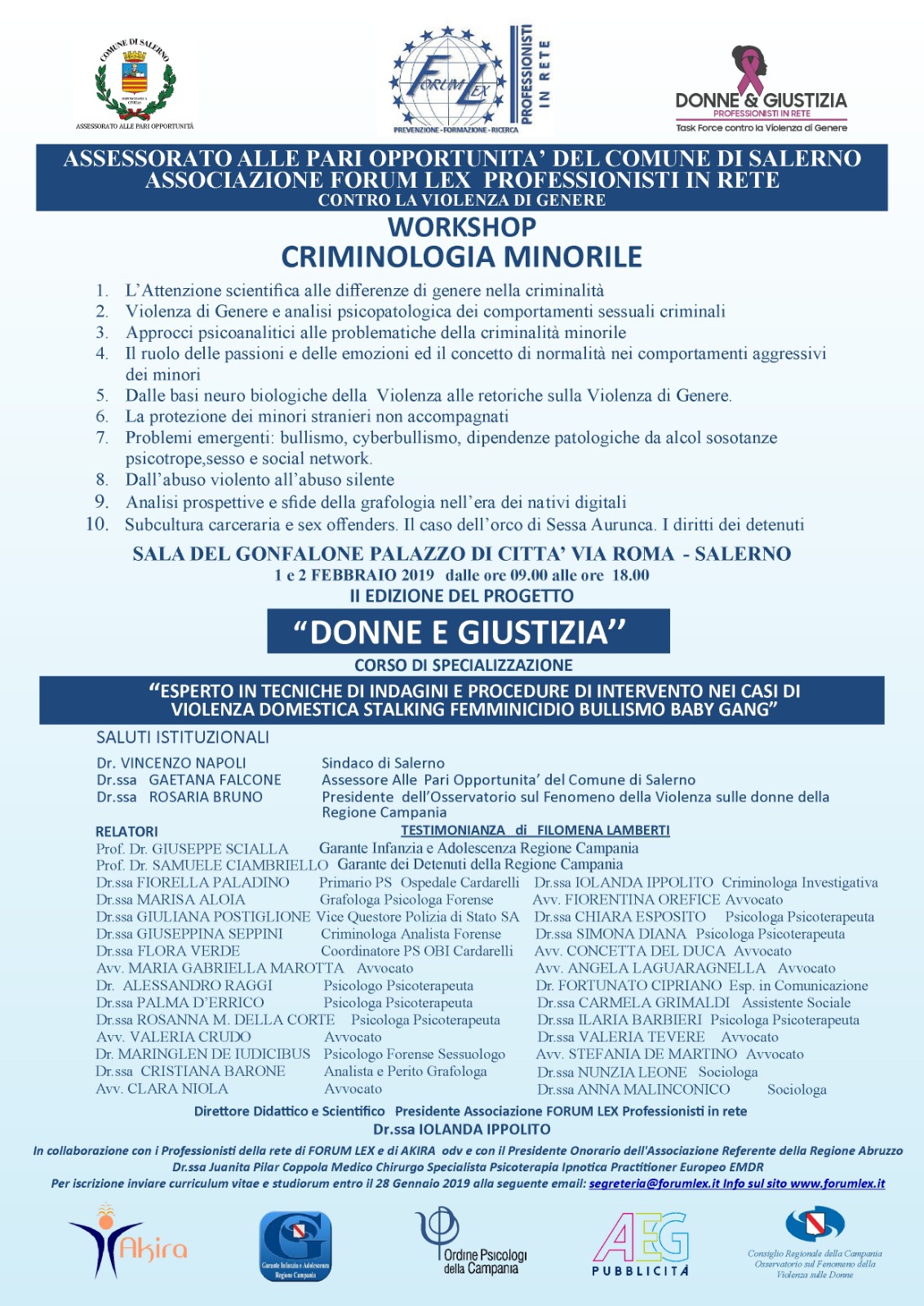 Si svolgerà il 1 e 2 Febbraio con inizio alle ore 9.00 nella Sala del Gonfalone del Comune di Salerno, il primo workshop sulla Criminologia Minorile organizzato dall’Associazione Nazionale Forum Lex  Professionisti  in rete.