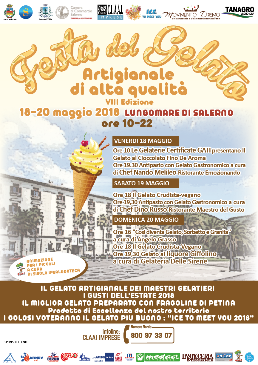 Il Lungomare di Salerno si appresta a celebrare con golose novità la Festa del Gelato Artigianale di Alta Qualità di Salerno “ICE TO MEET YOU”, in programma ogni giorno dal 18 al 20 maggio, dalle ore 10 alle 22, organizzata dalla CLAAI (Confederazione delle Libere Associazioni Artigiane Italiane) di Salerno, dal Movimento Turismo del cioccolato e delle eccellenze italiane in collaborazione con Tanagro Legno Idea, con il patrocinio del Comune di Salerno, della Camera di Commercio di Salerno e del Comune di Petina.
