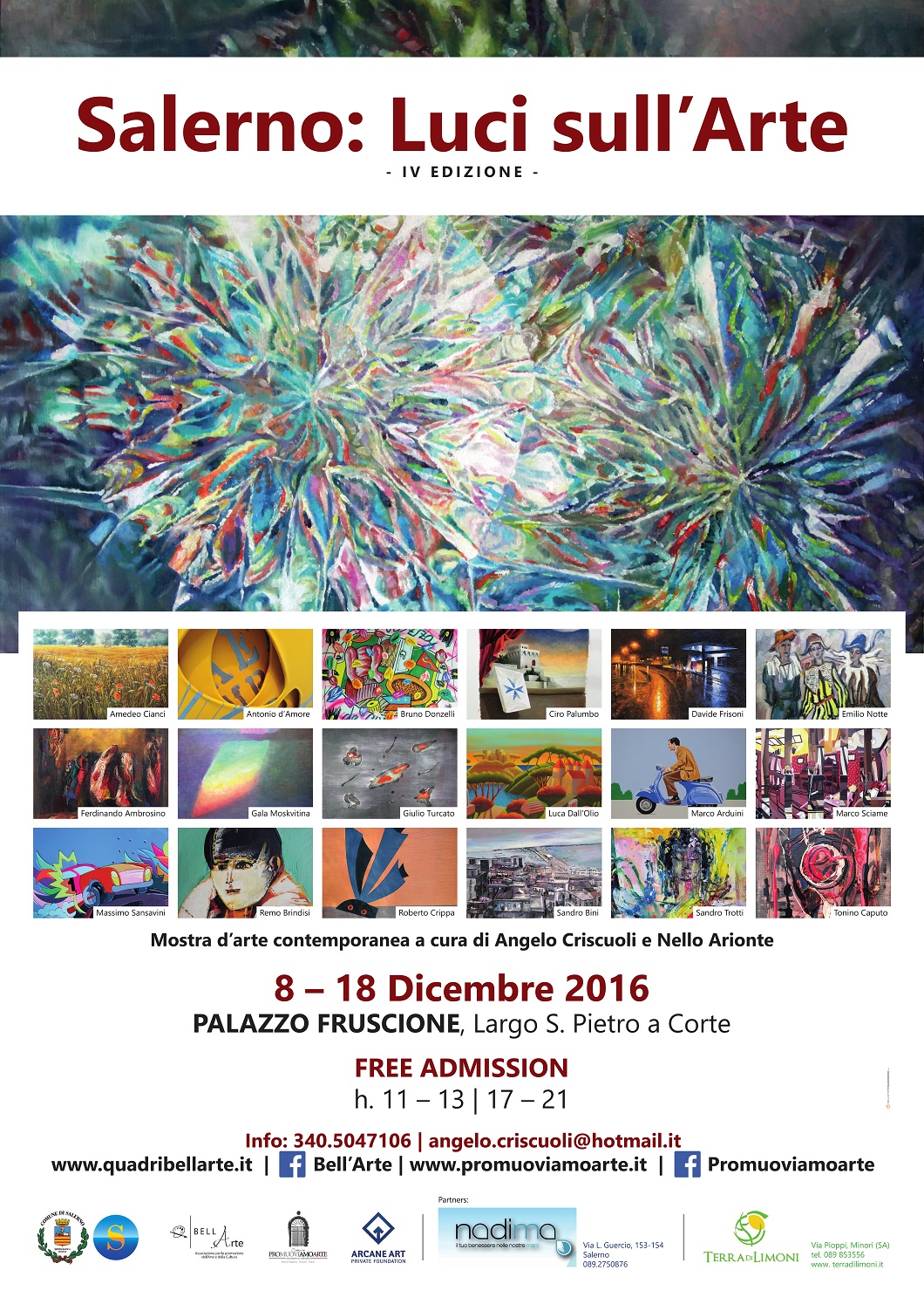 La collettiva, promossa dalle associazioni “Bell’Arte” e “Promuoviamoarte”, in collaborazione con l’“Arcane Art Foundation” di Kiev e patrocinata dal Comune di Salerno, sarà aperta dall’8 al 18 dicembre, presentando oltre 80 opere d’arte, tra pittura, scultura e grafica d’autore, opportunamente selezionate dai curatori Angelo Criscuoli e Nello Arionte.