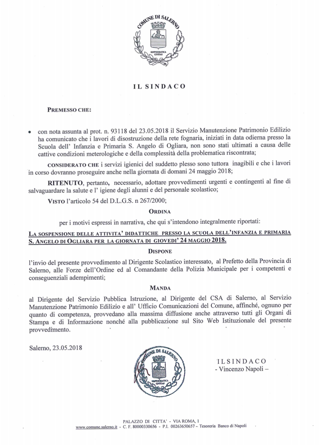 Descrizione Il sindaco di Salerno Vincenzo Napoli ha disposto la sospensione delle attività didattiche per la giornata di domani 24 maggio per la scuola dell'infanzia e primaria S. Angelo di Ogliara.