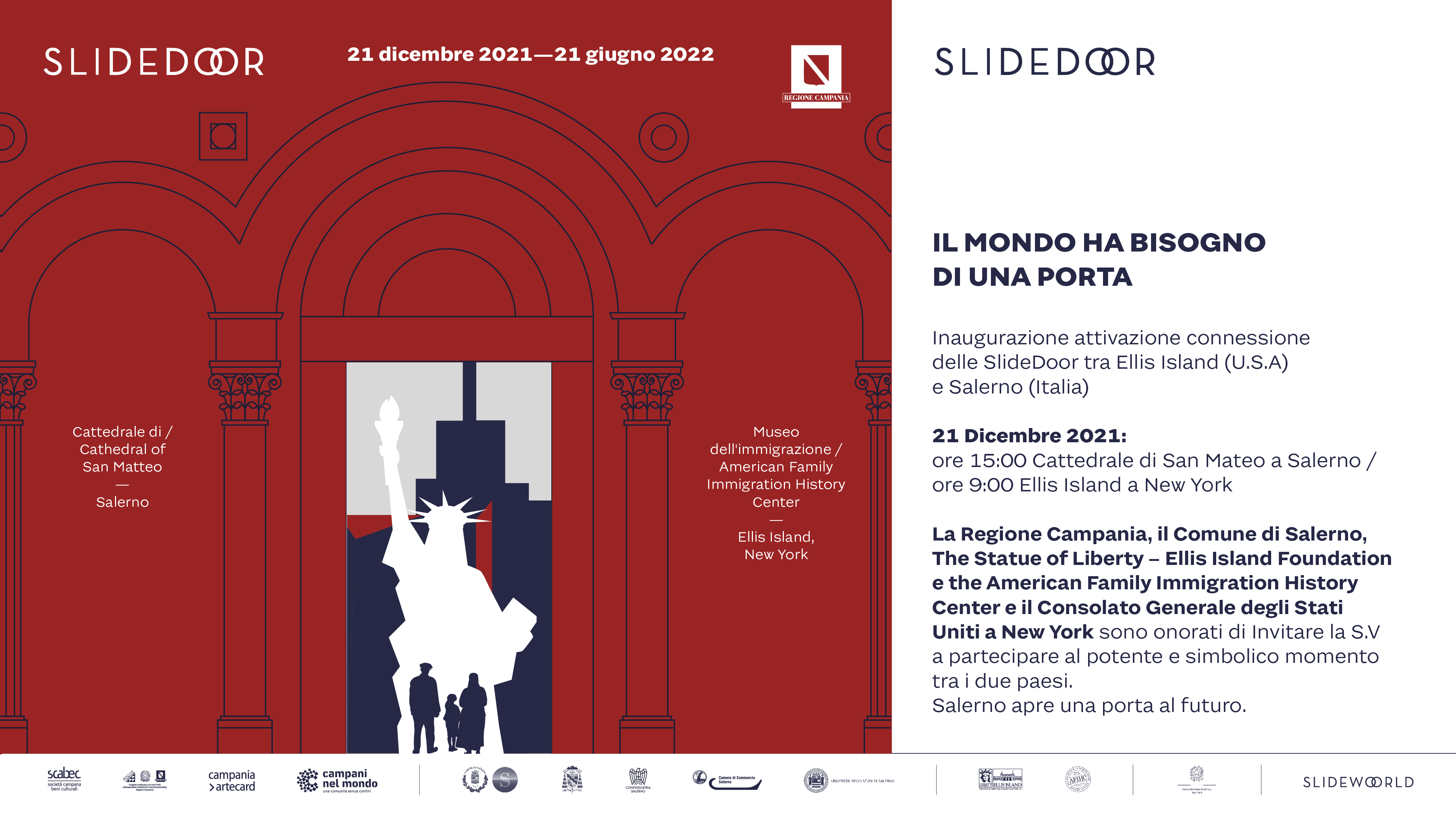 Il Comune di Salerno, con il sostegno della Presidenza della Regione Campania e di Scabec, con la straordinaria collaborazione di Ellis and Statue of Liberty Island Foundation, il Consolato Generale di Italia a New York e Slideworld, attueranno il progetto SLIDEDOOR: Il Mondo ha bisogno di una porta.