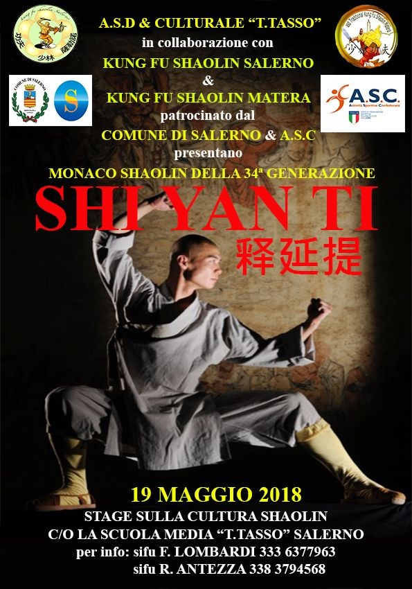 Sabato  19 maggio alle ore 10, presso la palestra della Scuola Media Torquato Tasso di Salerno in Via Michele Iannicelli 2 , l’Associazione Sportiva e Culturale Torquato Tasso, con il patrocinio del Comune di Salerno, ha organizzato l'evento culturale e sportivo, “STAGE SULLA CULTURA SHAOLIN” con la partecipazione di SHI YANTI, filosofo, maestro zen e monaco guerriero di 34° generazione, in rappresentanza ufficiale del “Tempio Shaolin” – Cina.