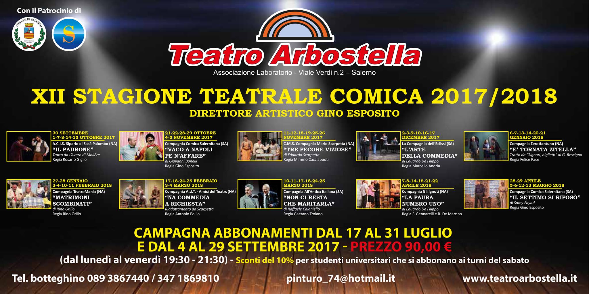 Giovedì 13 luglio è stata presentata al Teatro Arbostella la XII Stagione Teatrale Comica 2017/2018 del Teatro Arbostella con la regia di Gino Esposito. Dieci gli spettacoli di teatro comico in abbonamento: