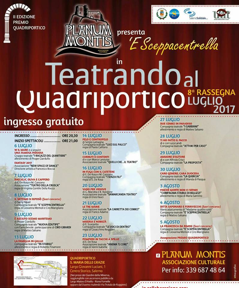 Questa mattina, a Palazzo di Città, alla presenza dell'Assessore all'Ambiente e allo Sport Angelo Caramanno, si è tenuta la presentazione di "Teatrando al Quadriportico", tradizionale rassegna estiva organizzata dall'Associazione Culturale "Planum Montis" e dalla compagnia teatrale "A Sceppantrella", in programma tutti i fine settimana dal 6 luglio al 5 agosto (con ingresso libero) presso il Quadriportico della Chiesa di S. Maria delle Grazie.