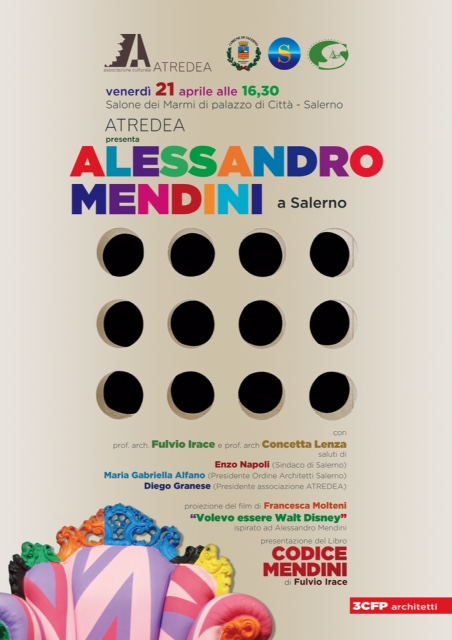 Nel corso dell'evento verrà presentato “Codice Mendini”, il libro di Electa che il prof. arch. Fulvio Irace, salernitano di nascita e di cuore ma milanese di adozione, ha scritto su Mendini quale opera completa che abbraccia tutto il lavoro dell’artista cogliendo ed argomentando tutte le varie e difficili sfaccettature delle sue “regole per progettare”. Come introduzione all'incontro, invece, verrà proiettato il film “ Volevo essere Walt Disney” di Francesca Molteni ed ispirato ad Alessandro Mendini.