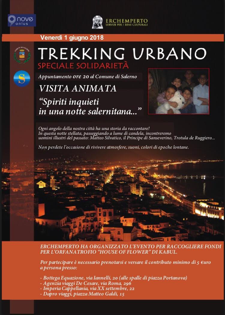 Si terrà venerdì 1 giugno (ore 20, partenza da Palazzo di Città - via Roma) l'evento "Trekking urbano - speciale solidarietà", patrocinato dal Comune di Salerno. Si tratta di una visita animata dal tema "Spiriti inquieti in una notte salernitana...".