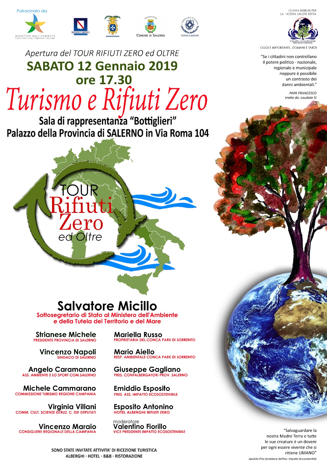 Sabato 12 gennaio, alle ore 17.30, presso la Sala Bottiglieri del Palazzo della Provincia di Salerno, in via Roma, si terrà la cerimonia di apertura della tappa campana del Tour Rifiuti Zero ed Oltre patrocinato dal Ministero dell'Ambiente.