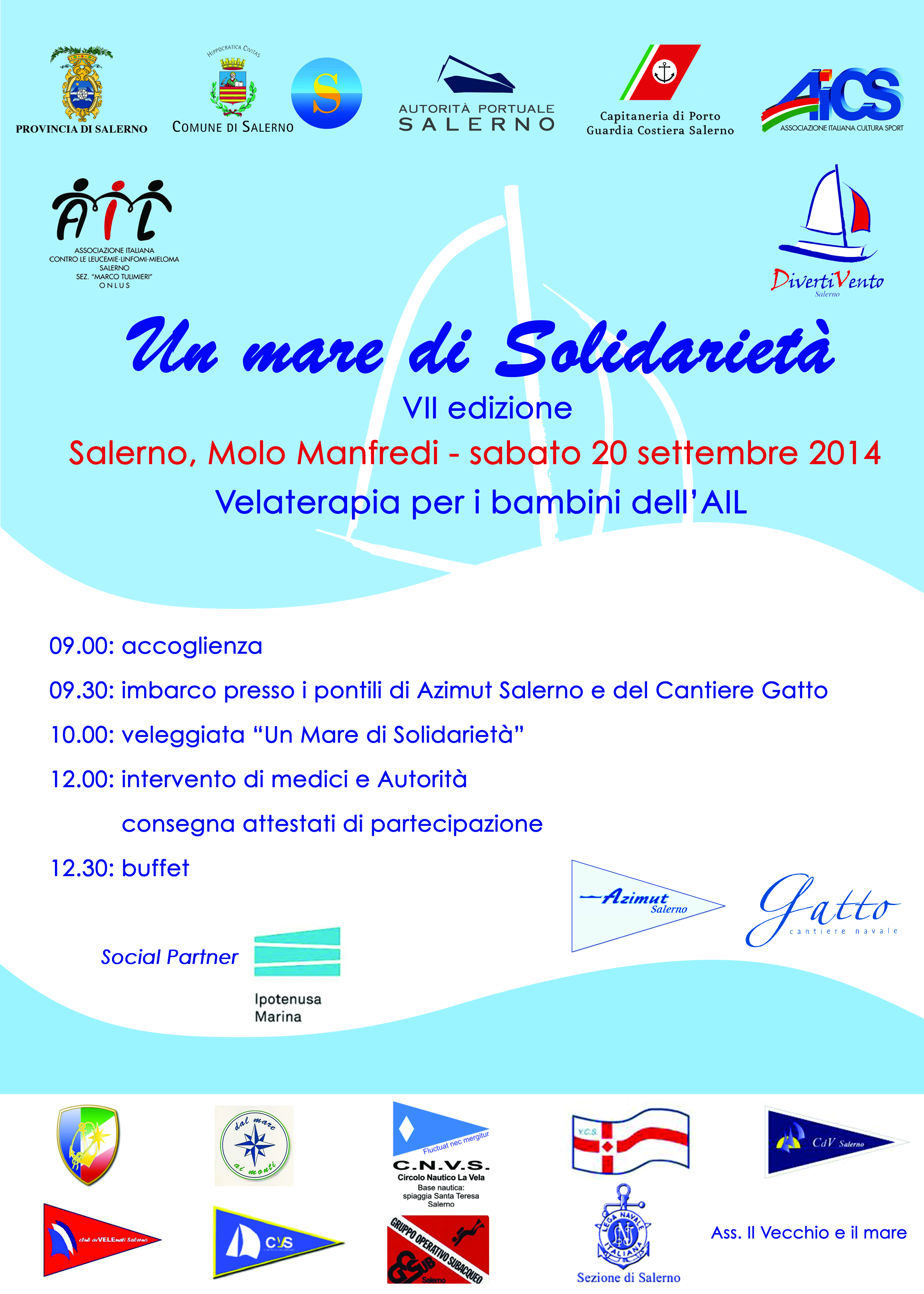 L’Associazione DivertiVento, in collaborazione con l’AIL – Sezione “Marco Tulimieri” di Salerno, ha organizzato per il 20 Settembre, presso il Molo Manfredi di Salerno, la VII edizione di “Un mare di solidarietà”, la manifestazione che intende far trascorrere una giornata sulle barche a vela ai bambini affetti da patologie onco – ematologiche. La velaterapia è un metodo innovativo che mira alla riabilitazione psicologica e al miglioramento della vita dei malati. La presenza su una stessa imbarcazione di pazienti in fase riabilitativa, medici e skipper fa sì che si possa vivere un’esperienza al di fuori dei luoghi di cura, in un contesto di reciprocità per cercare di recuperare il tempo rubato dalla sofferenza.