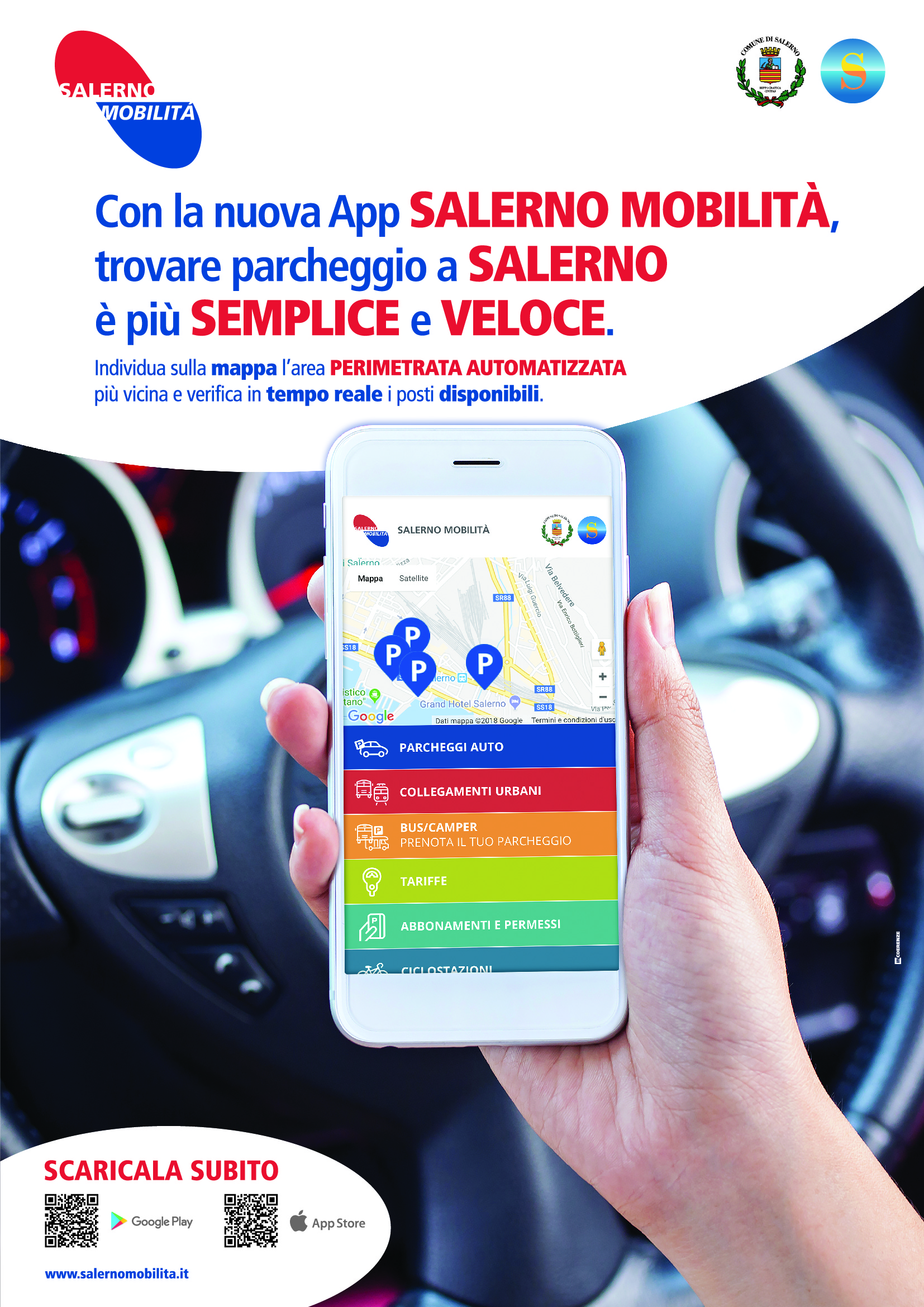 Martedì 3 luglio, in Piazza della Concordia, il Sindaco di Salerno Vincenzo Napoli, l'Assessore all'Urbanistica e alla Mobilità Mimmo De Maio e l'Amministratore Unico di Salerno Mobilità Massimiliano Giordano hanno presentato la App Salerno Mobilità che, proprio dal 3 luglio, è disponibile sugli smartphone della clientela che usufruisce dei parcheggi cittadini.
