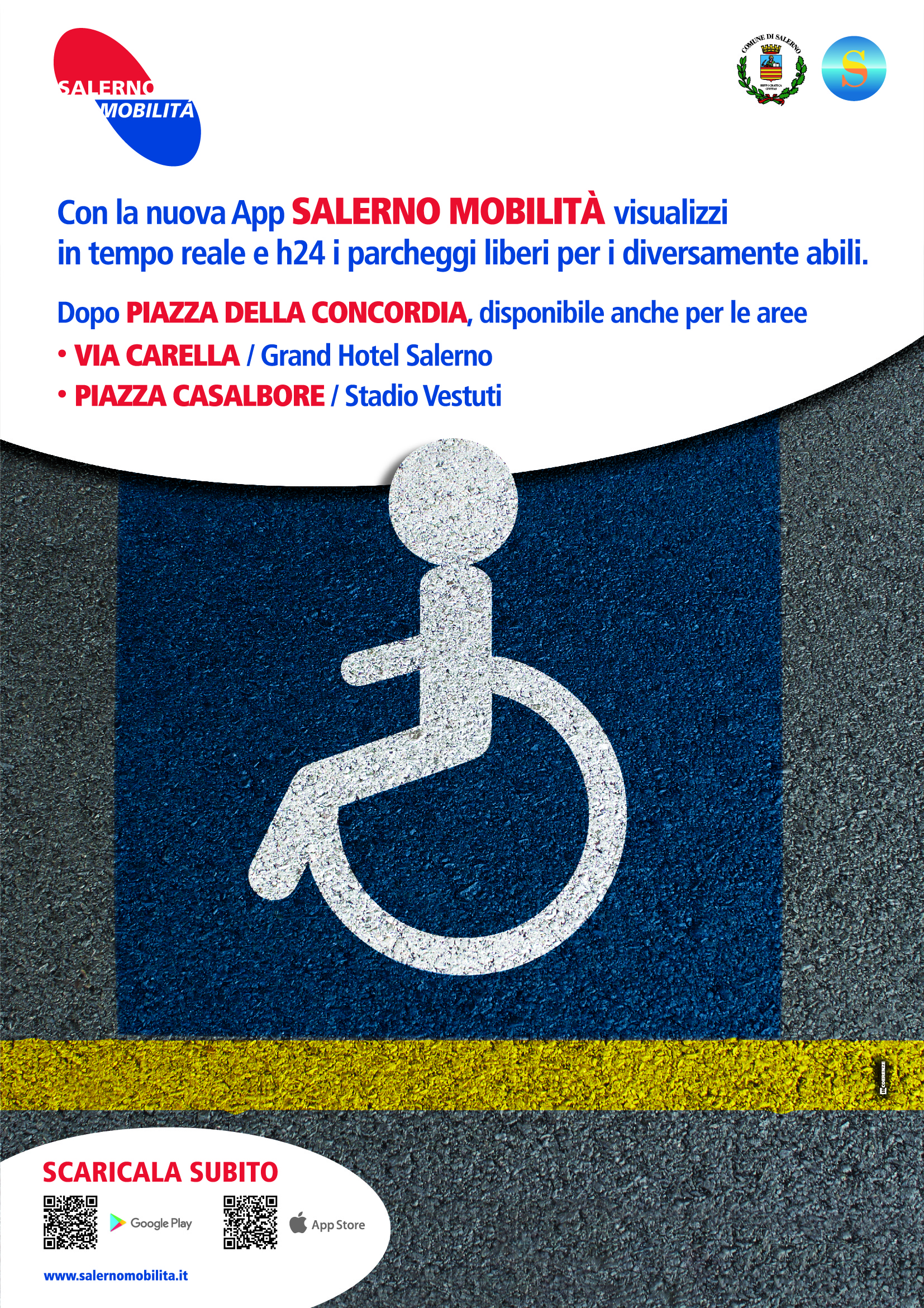 In più, per i disabili, oltre all’area già inaugurata a Concordia, sono state riservate due aree nel parcheggio di Via Carella (adiacente il GH Salerno) e nel parcheggio dell’area Stadio Vestuti, che con il sistema Smart Stop (o direttamente dalla nostra app) comunicherà in tempo reale la disponibilità degli stalli gialli dedicati ai portatori di handicap, cui l’amministrazione comunale rivolge già da tempo molta attenzione, concedendo il parcheggio gratuito nelle strisce blu - ma che da oggi avranno tre piccole aree a loro dedicate e di cui potranno avere conoscenza in tempo reale".