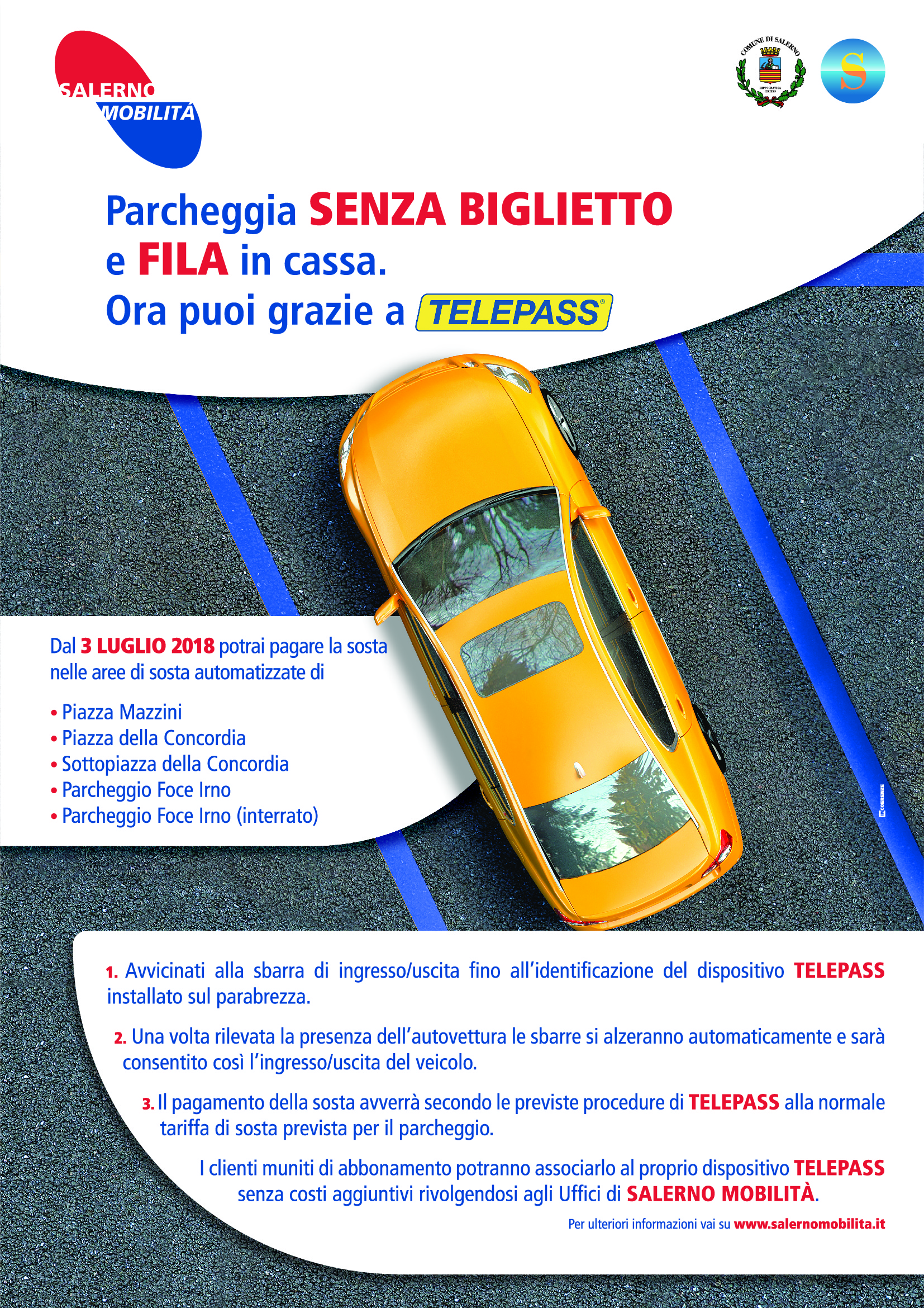 "Presentiamo due iniziative aziendali - dichiara l'AU di Salerno Mobilità Massimiliano Giordano - tese a rendere più agevole ricevere informazioni sui nostri servizi e dall’altro lato, ad utilizzarli in modo più semplice ed utile. Da oggi vi sarà la possibilità di ricevere informazioni in tempo reale sui posti liberi in tutte le nostre aree automatizzate, facendosi guidare con il navigatore cellulare direttamente in loco, nonché di accedere alle stesse (oltre che con i soliti mezzi di pagamento, dal contante alla carta di credito) anche attraverso l’utilizzo del dispositivo Telepass.
