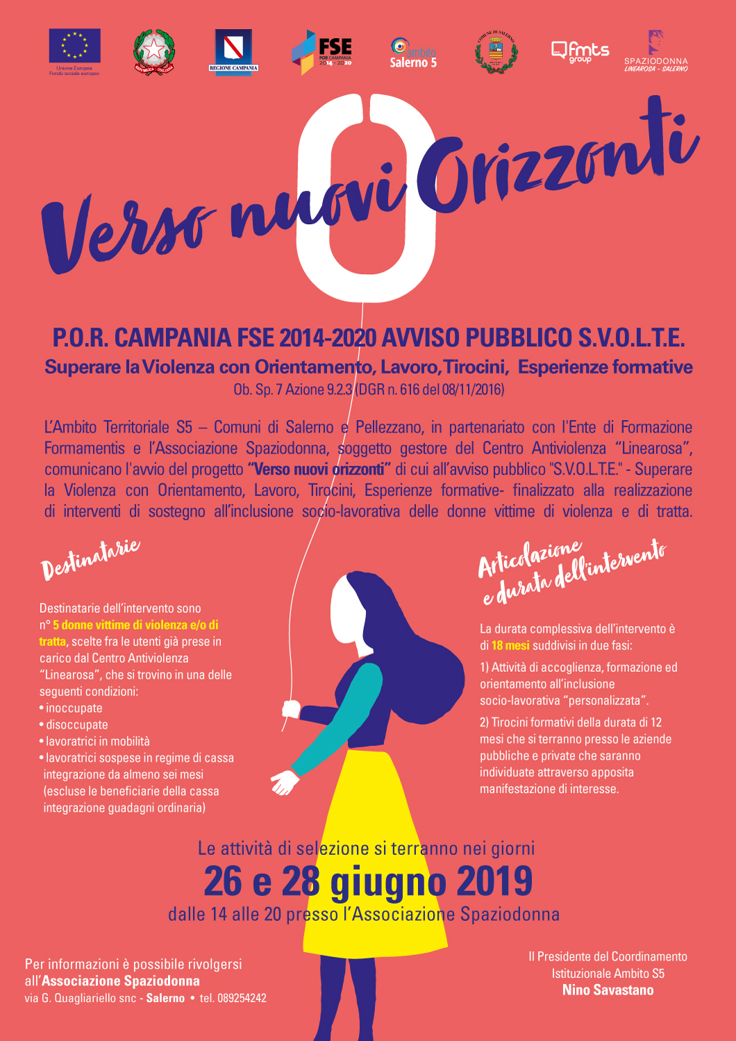 L'Ambito Territoriale S5 - Comuni di Salerno e Pellezzano, in partenariato con l'Ente di Formazione Formamentis e l'Associazione Spaziodonna, soggetto gestore del Centro Antiviolenza "Linearosa", comunicano l'avvio del progetto "Verso Nuovi Orizzonti" di cui all'avviso pubblico S.V.O.L.T.E. - Superare la Violenza con Orientamento, Lavoro, Tirocini, Esperienze formative - finalizzato alla realizzazione di interventi di sostegno all'inclusione socio-lavorativa delle donne vittime di violenza e di tratta.
