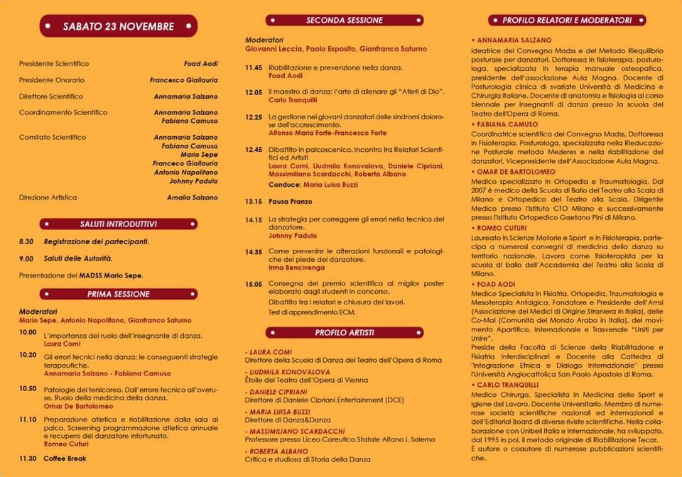 Focus di questa edizione: “Il ruolo del maestro di danza: conseguenze patologiche degli errori tecnici di danza e patologie strutturali limitanti la carriera dell’allievo”. L’obiettivo è sottolineare l’importanza delle conseguenze patologiche muscolo-tendinee derivanti dagli errori tecnici nella danza.
