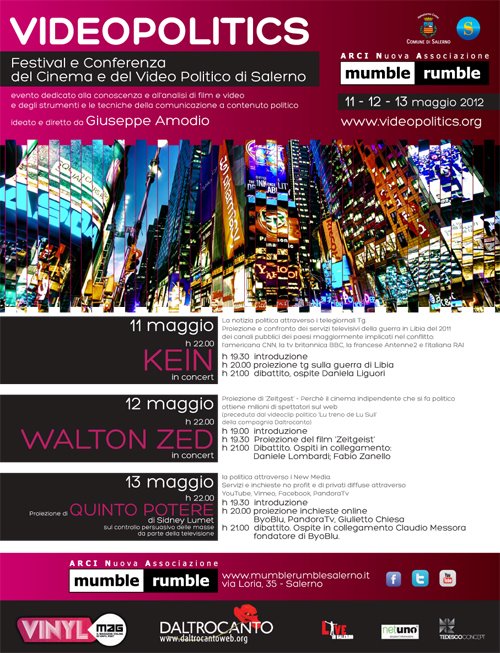 Si tiene dall'11 al 13 maggio 2012 al Circolo Mumble Rumble di Salerno "Videopolitics - Festival e Conferenza del Cinema e del Video Politico di Salerno".