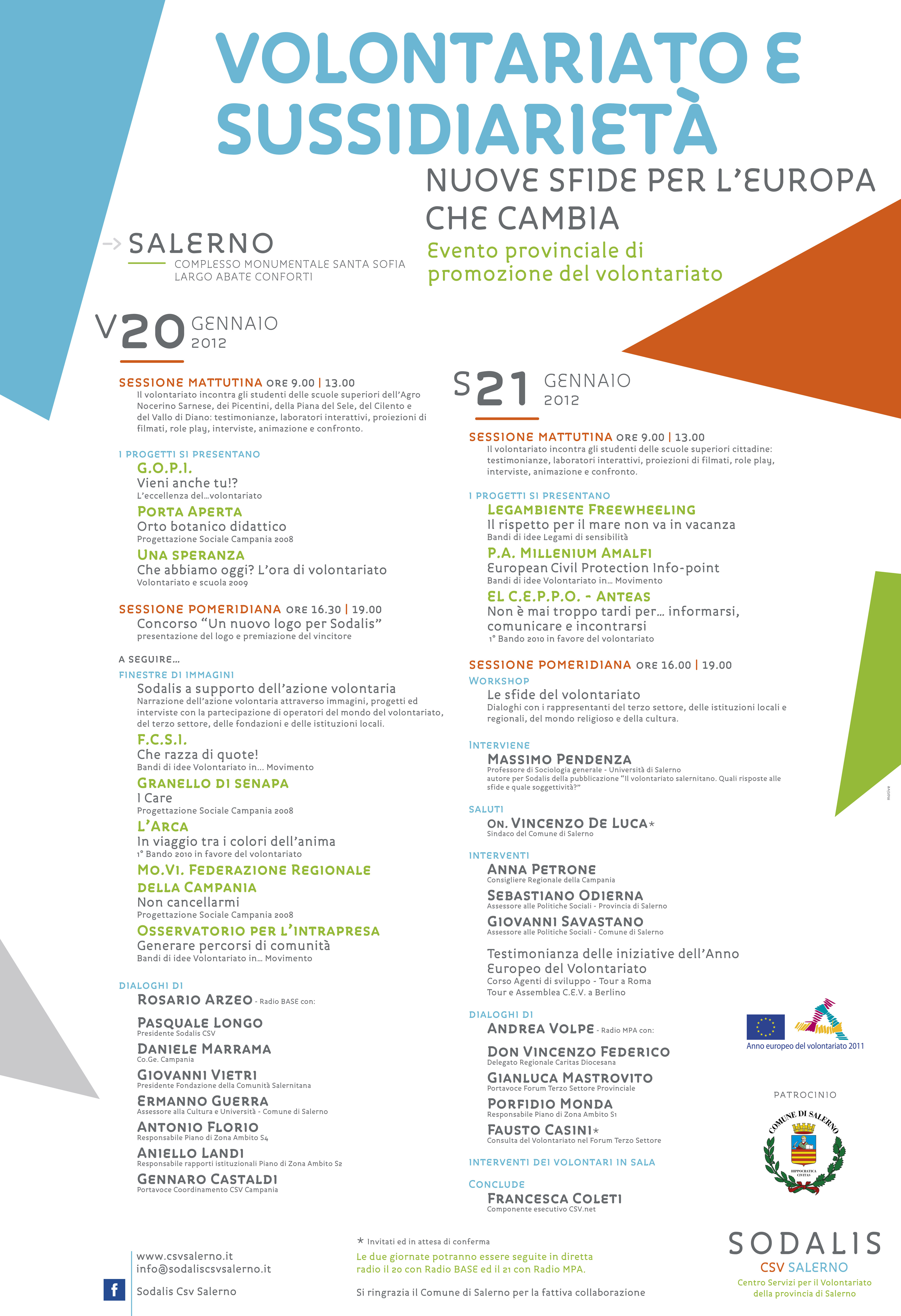 Venerdì 20 e sabato 21 gennaio 2011, al Complesso Monumentale di Santa Sofia, Largo Abate Conforti, prima edizione dell’evento provinciale di promozione del volontariato “Volontariato e sussidiarietà: nuove sfide per l’Europa che cambia”. La manifestazione è promossa da Sodalis CSVS, come evento conclusivo per l’Anno Europeo del Volontariato 2011, ed è patrocinata dal Comune di Salerno.