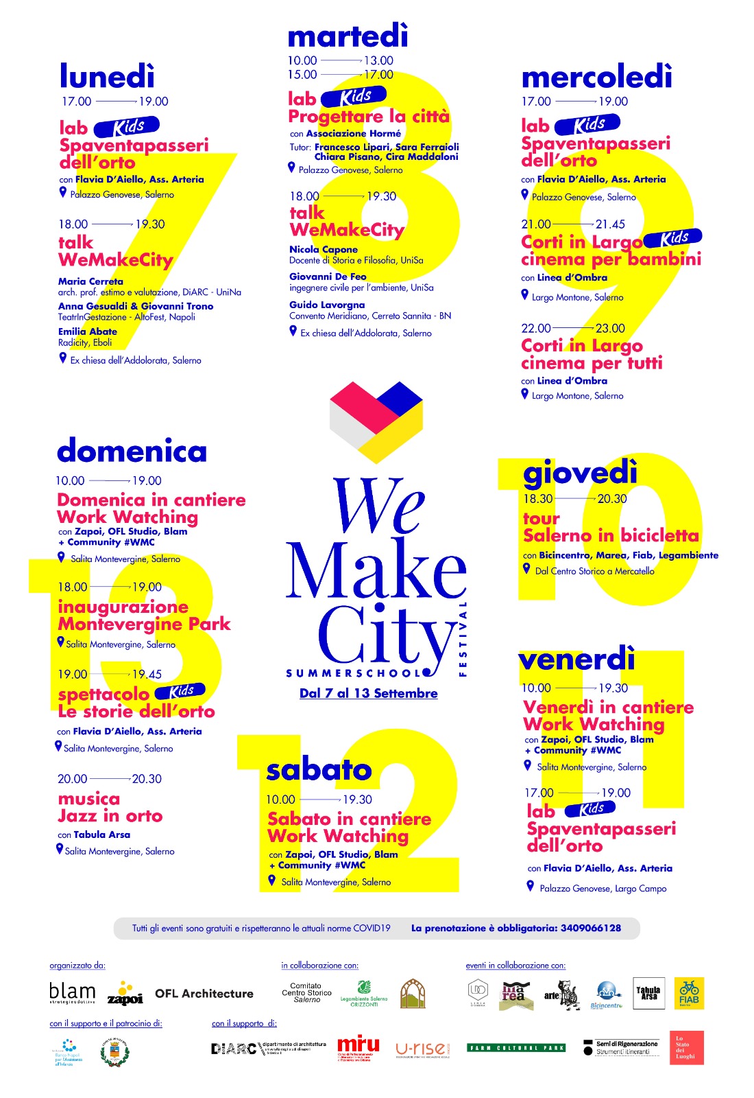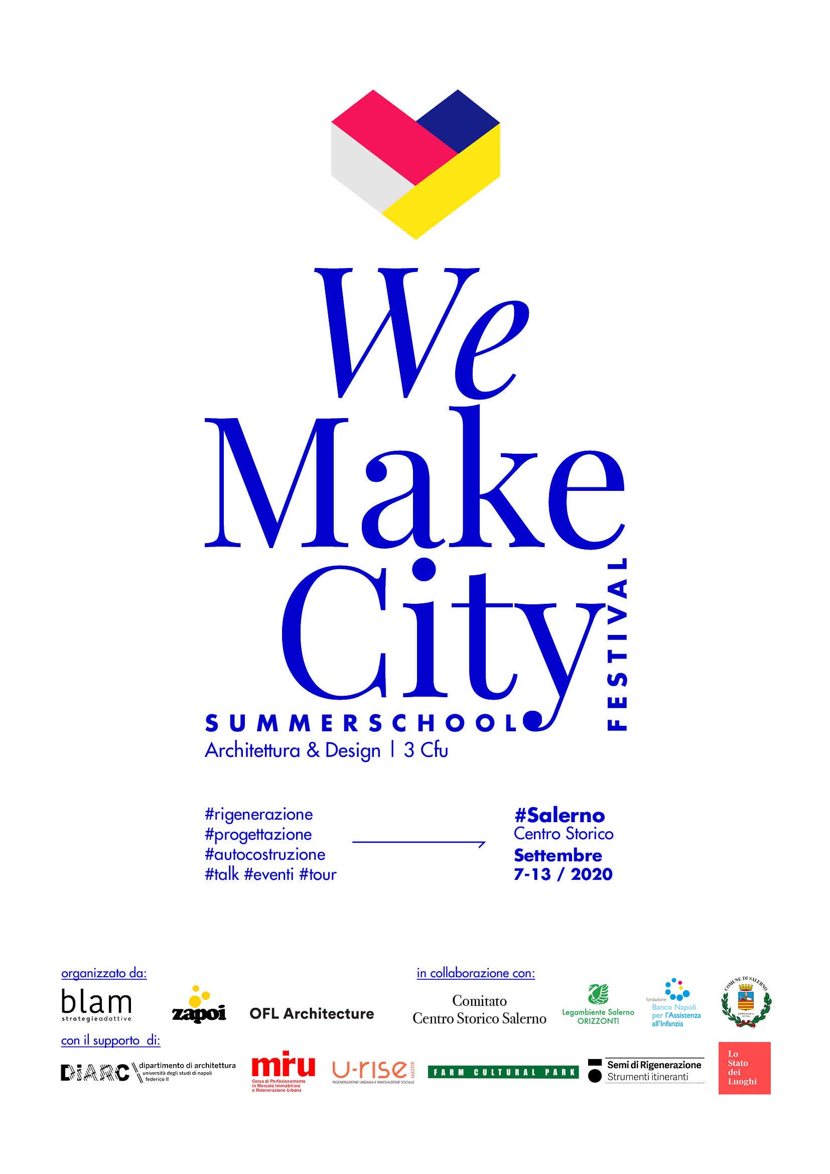 We Make City Festival è organizzato Da Blam, Zapoi e OFL Architecture. In collaborazione con Comitato Centro Storico, Legambiente Salerno “Orizzonti”, Fondazione Banco di Napoli per l’Assistenza all’Infanzia. Con il Supporto del Comune di Salerno, DiARC - Dipartimento di Architettura dell’Università degli Studi di Napoli Federico II, Miru - Corso di Perfezionamento in Mercato Immobiliare e Rigenerazione Urbana, Master U-rise, Farm Cultural Park, Semi di Rigenerazione.
