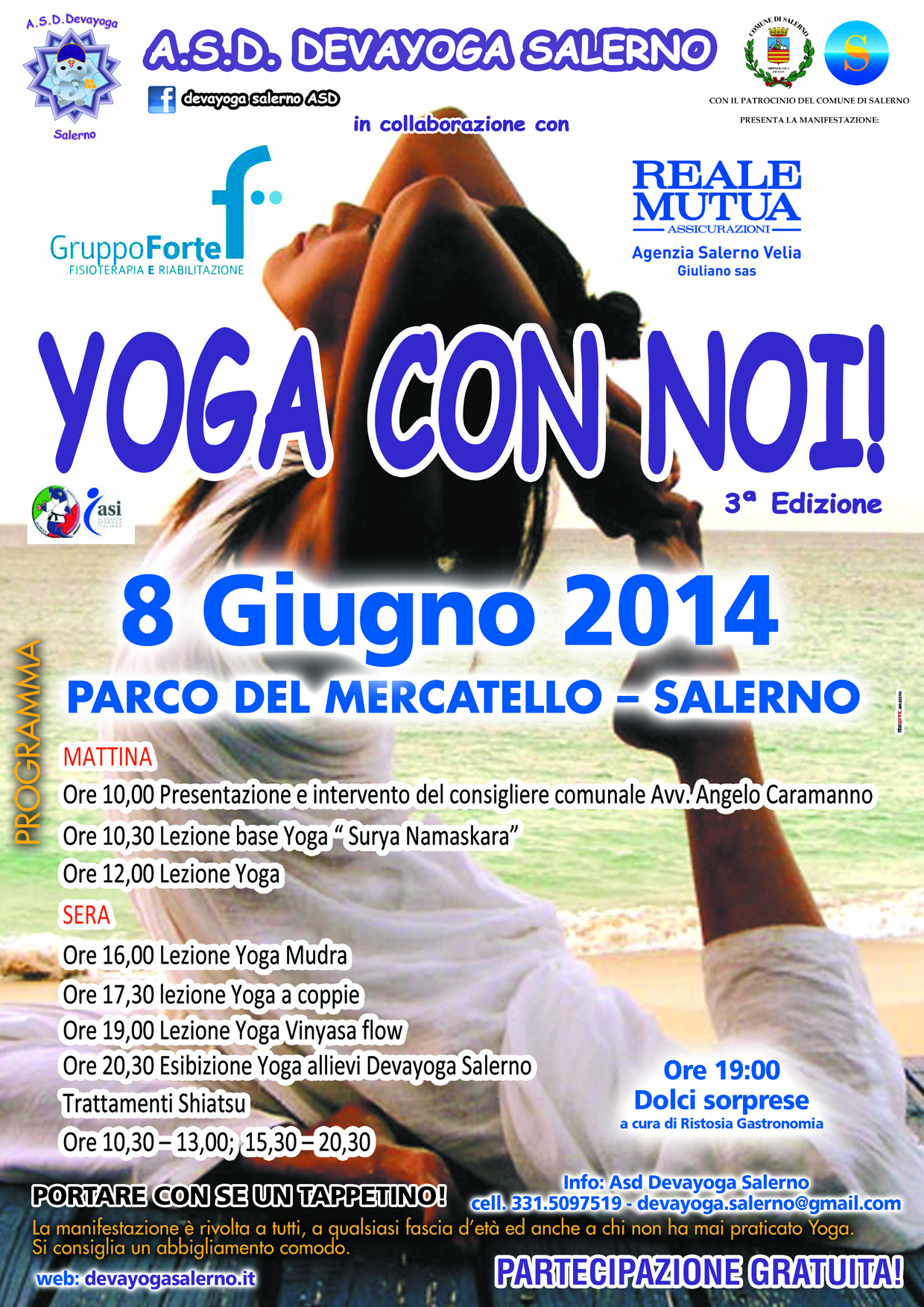 L'associazione Devayoga Salerno è lieta di invitare la cittadinanza alla terza edizione della manifestazione "Yoga con noi!" che si svolgerà al Parco del Mercatello domenica 8 giugno dalle ore 10,00 alle ore 21,00.